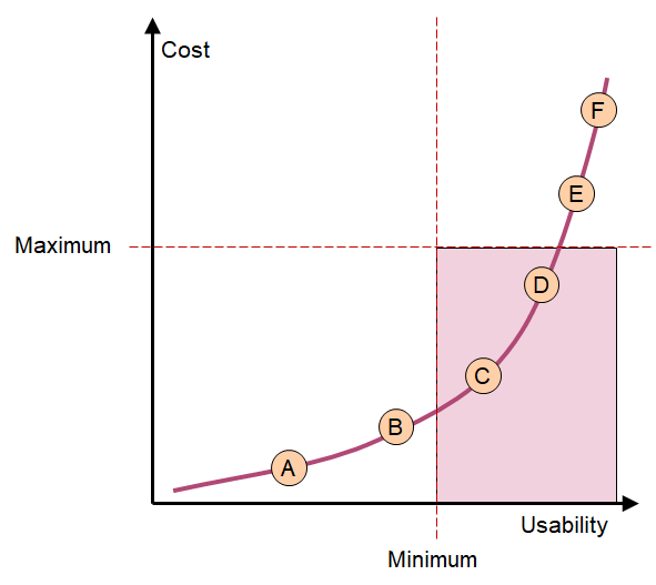 The cost to benefit curve seldom is linear but behaves according to the diagram below. It compares six different scenarios: availability achieved and their cost. When business objectives are set for the axes, only options C and D are seen to satisfy the constraints.