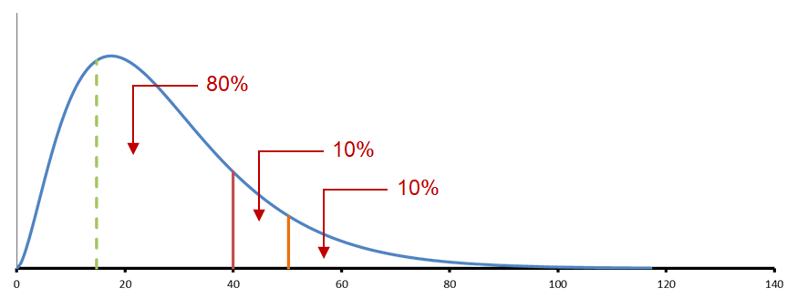 The blue curve shows the distribution of time-to-resolve. What is essential is the area under the curve, which indicates the number of cases. In our example, 80 % of the incidents are resolved within 40 hours (the red vertical line). The average time is not at the halfway between 0 and 40 but shorter: about 15 hours (the green dashed line).
