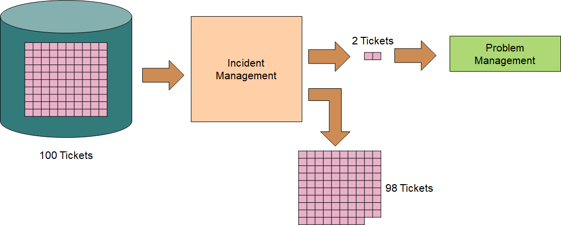 In our example, it was decided to filter 98 out of 100 Tickets and send the remaining two only to Problem Management. This ratio can be close to what you often end up with. Filtering can be done by setting a ceiling on human resources, the number of tickets to be further processed, problem management total cost, etc.