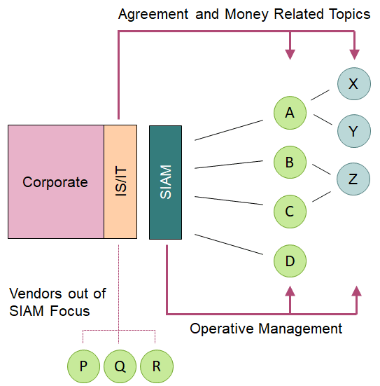 In the SIAM model, the pain is transferred to an organization, which is often called a SIAM operator. It is given responsibility (and hopefully also the power) to steer and control other vendors. However, it is good to remember that also in the SIAM model, each service provider is responsible for its subcontractors. The scope of SIAM seldom includes the chain of subcontractors.