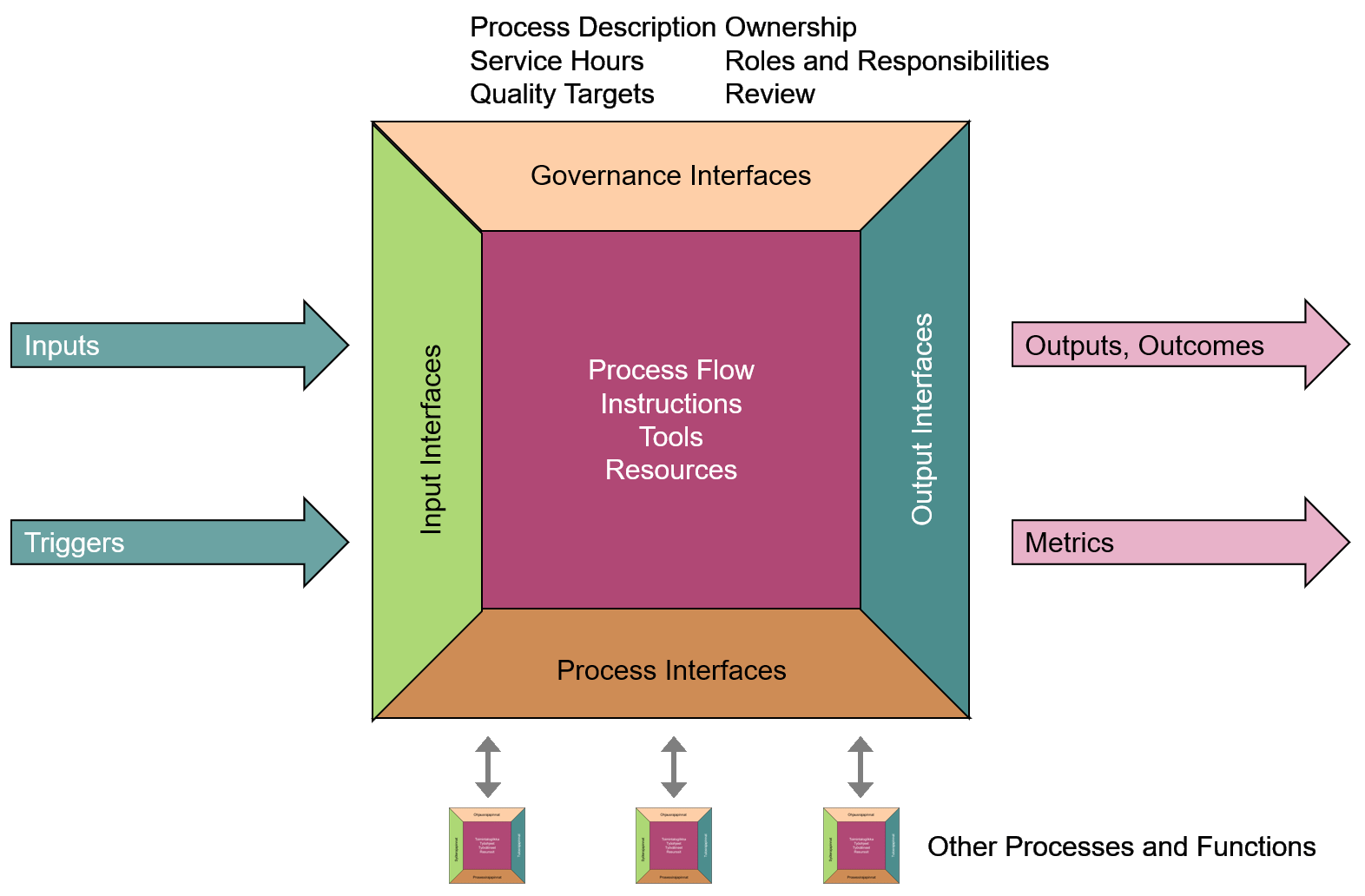At the top, there are interfaces and metadata related to the governance: process description, service hours, success criteria, quality metrics, how to access the process, etc. Ownership is the key thing: A process without ownership and out of control and monitoring, will not survive.