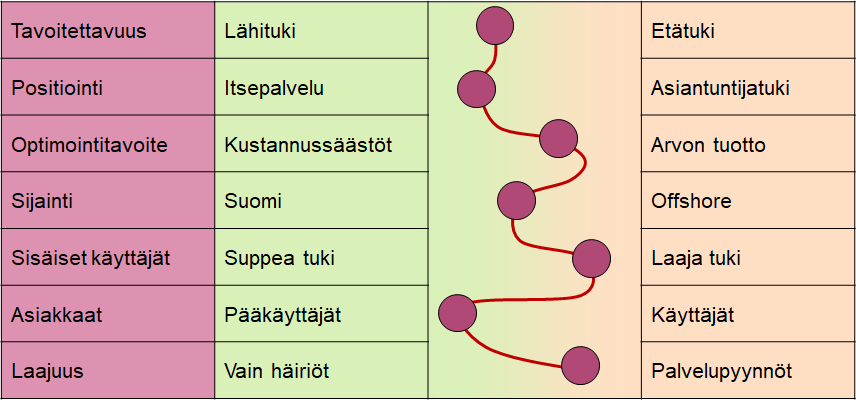 Punaiset ympyrät osoittavat tehtyä valintaa. Taulukon rivit eivät ole täysin riippumattomia toisistaan. Siksi se on hyvä laatia huolellisesti ristiriitaisuuksien välttämiseksi.